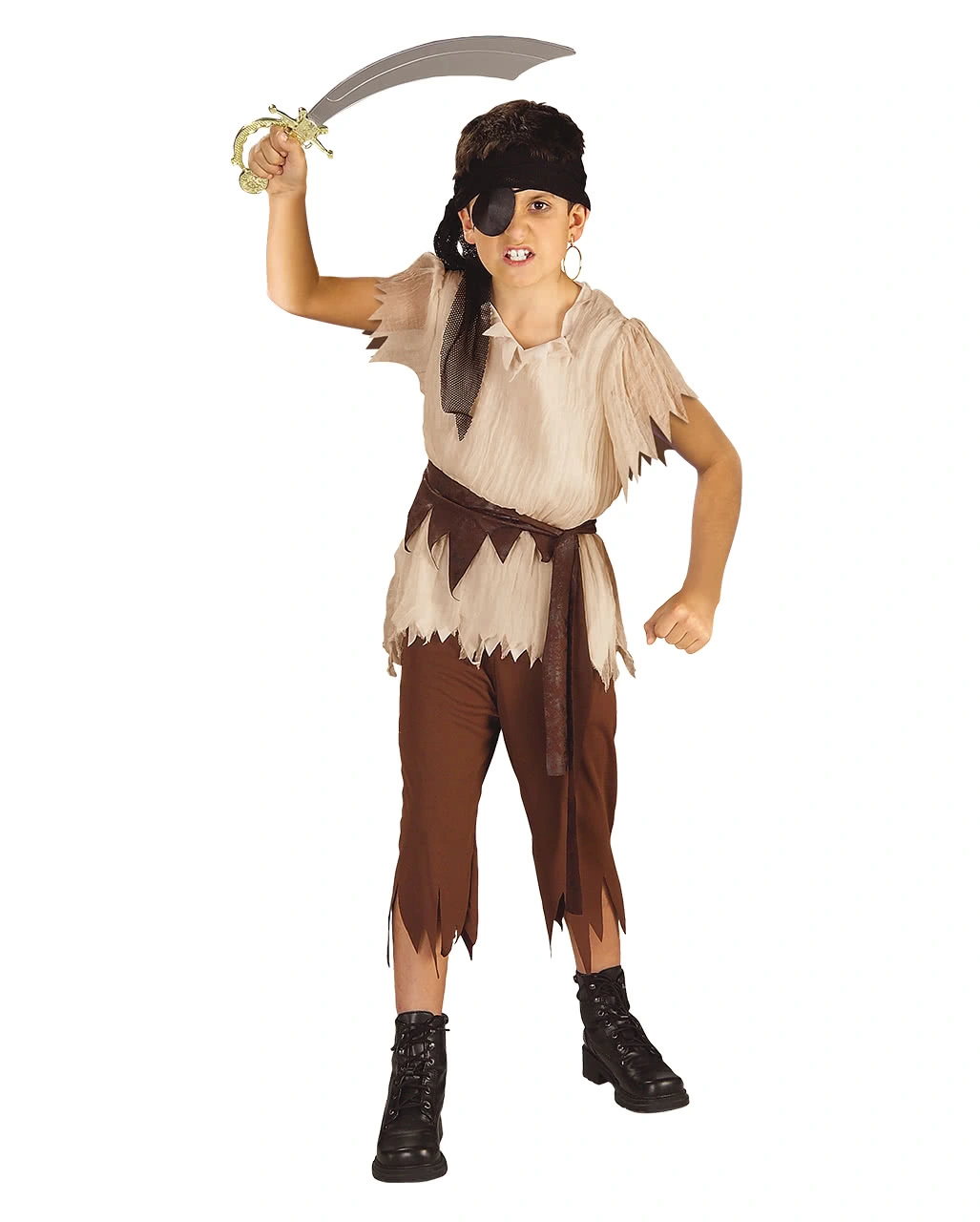 Das Kinderkostüm Pirat mit Stirnband besteht aus Hemd, Hose, Taillenschärpe und Stirnband. Das Hemd des Seeräuber-Kinderkostüms ist weit geschnitten, weist an Ärmeln und Bund deutliche Kampfspuren in Form von stilisierten Rissen auf und erzeugt durch das Beige sofort eine altertümliche Leinen-Optik. Die braune Hose verfügt über einen dehnbaren Bund für optimalen Tragekomfort und perfekte Passform und ist im typischen Piraten-Stil kurz geschnitten. Auch hier zeigen gezackte Risse am Saum, wie tapfer du dich bisher geschlagen hast. Die braune Taillenschärpe kannst du dir locker um die Hüfte binden, um beispielsweise deinen Säbel zu verstauen. Abgerundet wird das Seeräuber-Kostüm durch ein schwarzes Stirnband in Gitter-Optik, welches du dir um den Kopf binden kannst, sodass es wie ein Kopftuch an den Seiten herabfällt. Dazu passen das Piratensäbel als Piratenschwert lang 70cm.